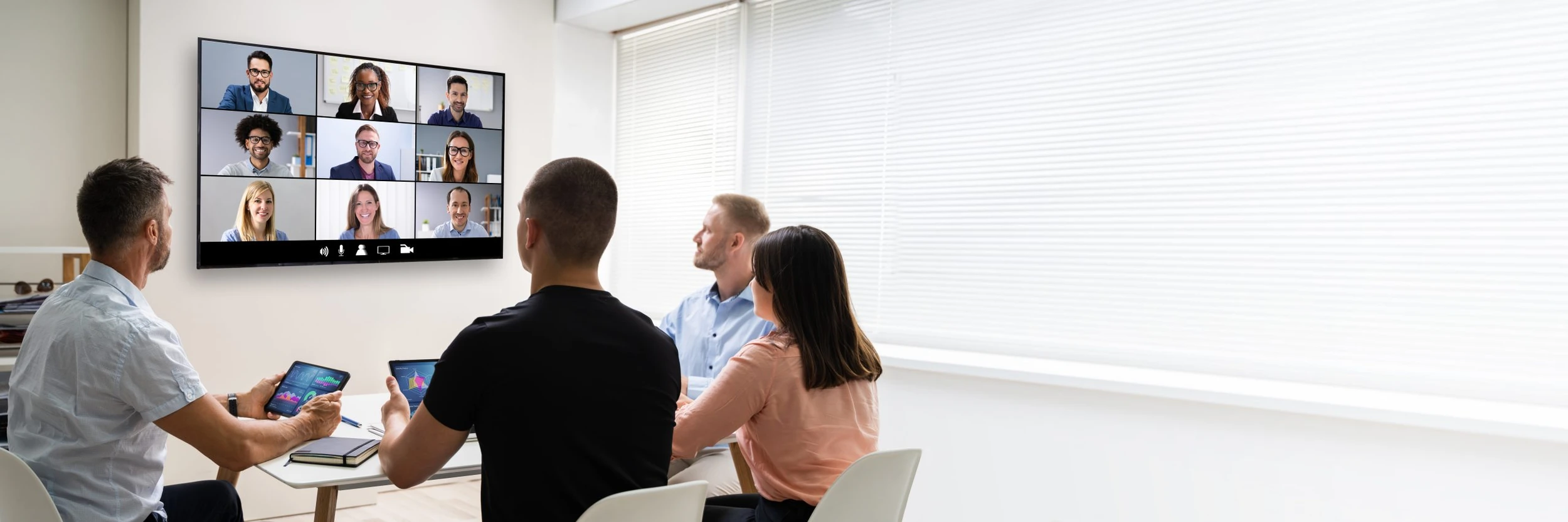 The right system depends on the room and the use case, but commercial conference room equipment often includes: